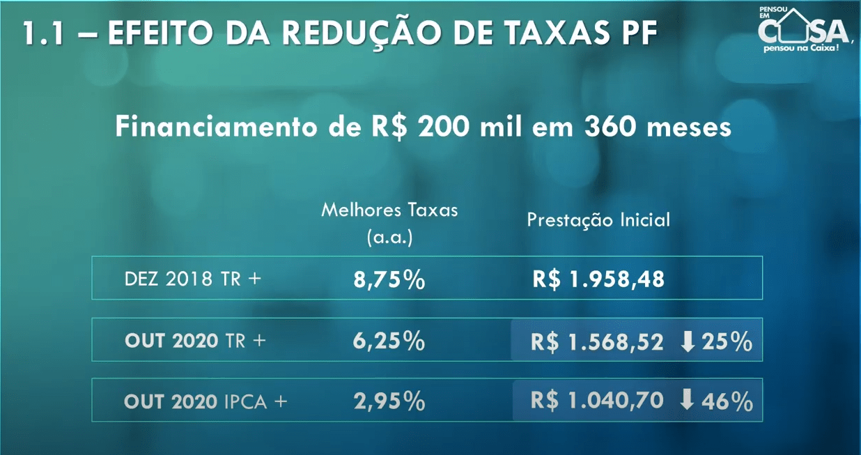 “Com a nova taxa, a parcela inicial da prestação do financiamento pode cair cerca de 25% para o trabalhador”, explicou Pedro Guimarães, presidente da Caixa. A economia refere-se à simulação de um financiamento de R$ 200 mil, em 360 meses, comparando a nova taxa com os juros praticados pelo banco em dezembro de 2018.